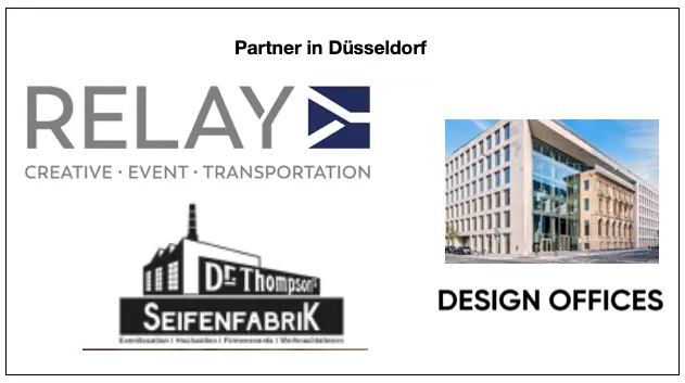 09:30 „ Transfer“ zum Workshop, Präsentation der ICJ Event Diamond Partner (siehe unten) in den DESIGN OFFICES NRW