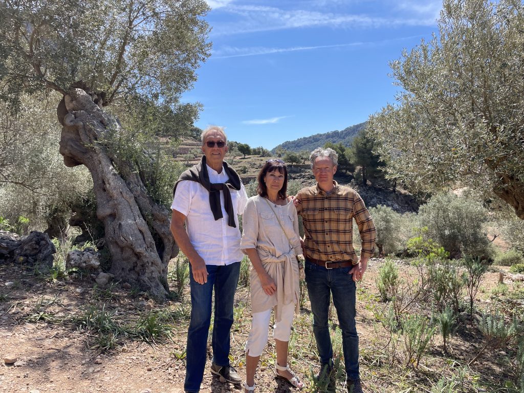 ICJ ambassadors Gerald W. Huft und Petra M. Schlosser mit dem Manager des Olivenhains, Bernd Ihgmüller, der mit größter Hingabe und Begeisterung dieses herrliche Fleckchen Erde bewirtschaftet. Die großartigen Wurzelstämme zeigen eine Vielfalt an Formen, die jeden Künstler begeistern.
