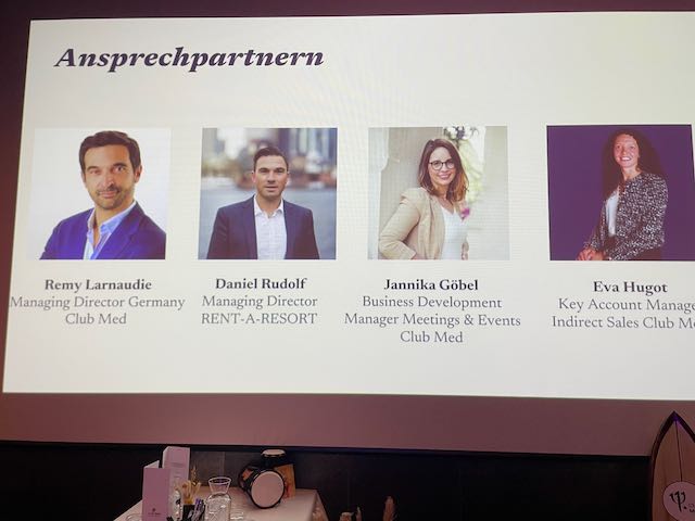 von links nach rechts :(Gerald Huft, Icj Ambassadors on Tour, Daniel Rudolf, RENT-A-RESORT, Eva Hugot, Club Med Reiseveranstalter, Remy Arnaudie, General Manager Club Med Jannika Göbel, Business Development MICE , Petra M. Schlosser, PSnetwork Marketing & PR )
