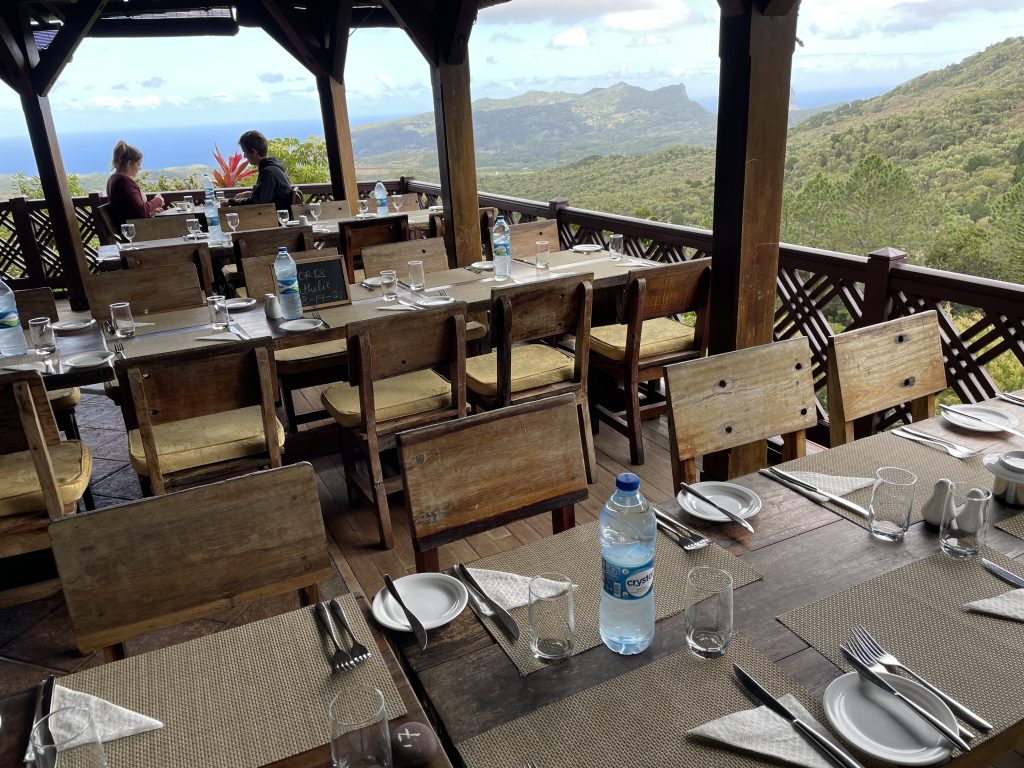 Der Besitzer  José Hitié des Restaurants Varangue sur Morne mit seiner Lebensgefährtin begrüßte die Gruppe persönlich und erzählte von seiner Anfangszeit in der    ehemaligen Jagdhütte. Er verliebte sich in diesen phantastischen Ausblick und wollte dies auch internationalen Gästen möglich machen. Daher startete er ein Restaurant  und hat mittlerweile großen Erfolg und eine Menge VIPS aus der Welt willkommen geheißen. Von Jacques Chira, Roberto de Niro sowie Prinz Edward und viele mehr. Sie alle waren begeistert von dem Panorama aber auch von den Köstlichkeiten die von der französischen Küche inspiriert mit einheimischen Gewürzen verfeinert ein echtes Erlebnis darstellen.